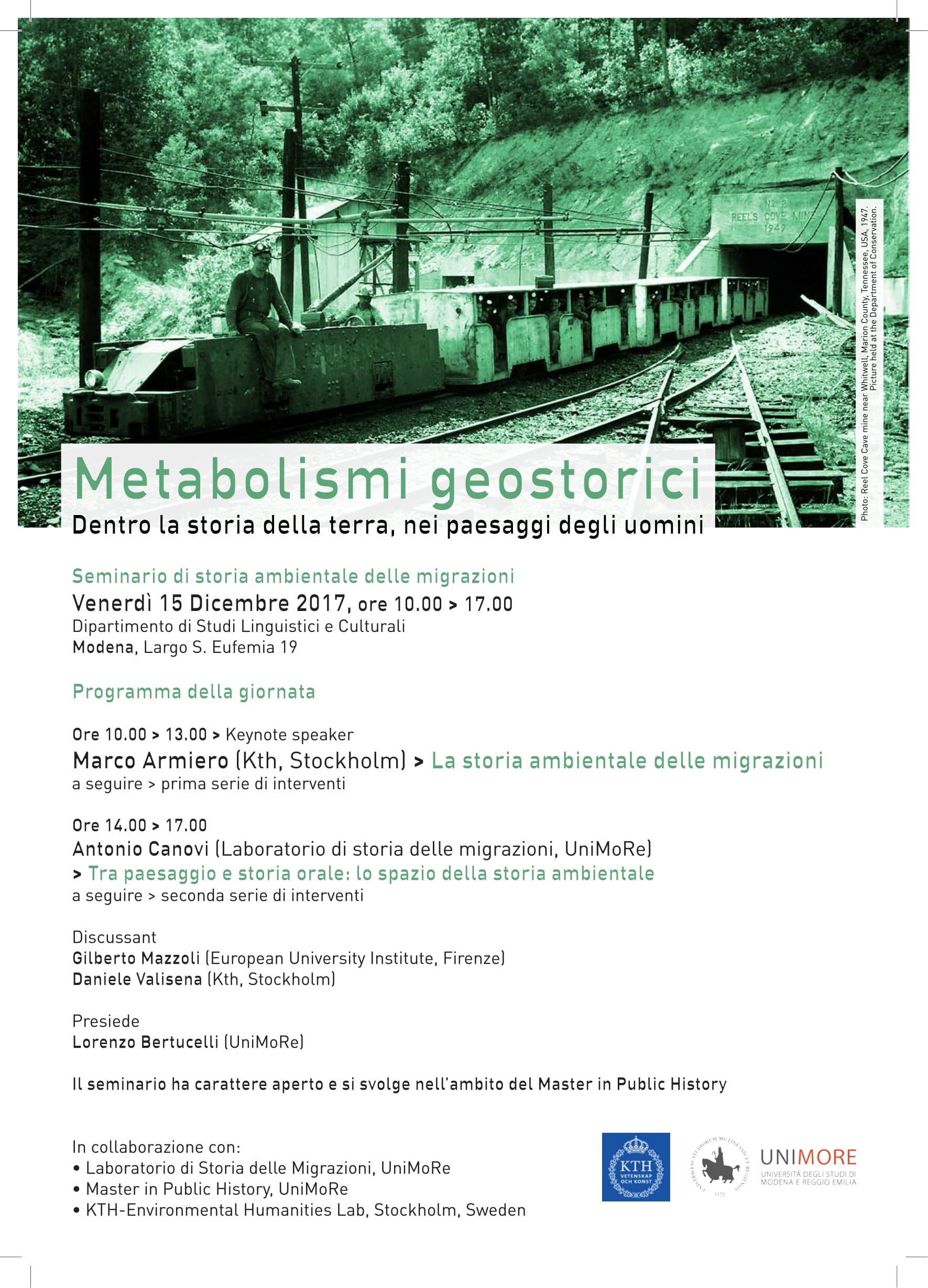 Gli studi migratori, che allUniversità di Modena e Reggio Emilia da più di un lustro hanno trovato casa nel Laboratorio di Storia delle Migrazioni, si inseriscono perfettamente in questo terreno di ricerca e divulgazione didattica e scientifica. Da tale percorso prende le mosse questo primo seminario dal titolo Metabolismi geostorici. Dentro la storia della terra, nei paesaggi degli uomini. Organizzata nellambito del Master in Public History, in collaborazione con il KTH Environmental Humanities Laboratory di Stoccolma, la giornata di studi si concentrerà sul tema dei metabolismi geostorici e sul contributo dei migranti a trasformare e produrre luoghi materiali e culturali attraverso lavoro, pratiche del quotidiano, trasmissione di memorie e costruzioni di identità e paesaggi transnazionali. Dai